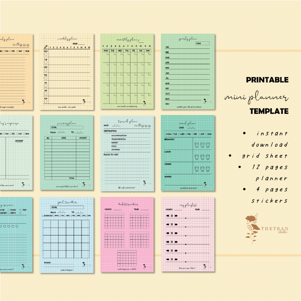This is a DIGITAL ITEM for Online Purchasing includes 2 sets (planner & study template): a daily plan, weekly plan, monthly plan, yearly plan, expense, saving plan, travel, meal plan, habit tracker, goal tracker, my review, and playlist, flower, butterfly, deer, and planet stickers...